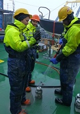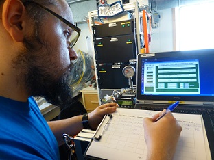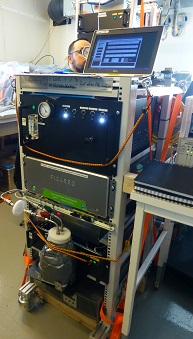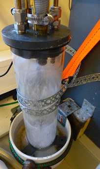 | Maybe you are thinking now “so what, just more one of these fancy commercial instruments that scientists use?” – but even if it doesn’t look “home-made”, all the black boxes part is actually things built by Marc himself. The original methane analyzer is usually used for atmospheric measurements, now it is connected to a shower-head equilibrator that gets methane out for the water in a gas headspace that is measured with the analyzer (same principle that happens in my stripping board + beerkegs or our samples from the Niskin bottles, just has to happen faster and more efficient – because the water sample keeps changing quickly as the ship moves. And it really works faster and more efficient, because in contrast to my stripping board system, there is no gas introduced in the water to get the methane out, but the water sample is sprayed into a gas chamber in form of small droplet (like a shower, thus the name of the equilibrator), which makes it way easier for the methane to leave the water and transfer into the headspace. This system is running and recording data fully automatic, and so far it is working really well throughout the cruise, but it also requires quite some effort to keep it running – there is occasional pressure and flow fluctuation in the seater intake (e.g when ice gets stuck in the line), in general there is the saltwater that can have really destructive influence on all instrument parts (both inside the system and the outside spray on the instrument from occasional small floodings coming from the seawater intake, e.g. when I take my samples) and then there is vibrations of the ship that tend to losen electrical connections, and of course running 24/7 without any problems is always a bit of a challenge for any instrument, self-constructed or not. And even no real problems have occured so far – that is also mainly due to Marc keeping an eye on it, running checks, fixing loose connectors and performing small maintenance operations. So, he always has some big or small things to do with his online measurement, in addition to his discrete sampling of methane and carbon dioxide samples from the Niskin bottles. |