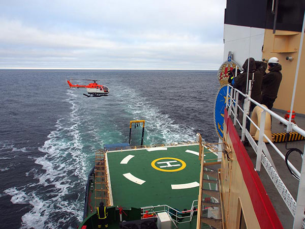 Mapping of the southern Lomonosov Ridge started September 13 with the acquisition of a seismic line. Tom and Arne were sure eager to put their gear into the water once again. The weather was really nice with low winds. A long successful seismic line was acquired from outside of the Russian Economic Zone to the peak of the southern Lomonosov Ridge. Sediments draped the underlying bedrock beautifully. We have proposed to do drill within the program Integrated Ocean Drilling Program (IODP) in this area of the Lomonosov Ridge. For this reason, the German research vessel Polarstern was here to do so-called site surveying. They towed a 3 km long hydrophone streamer and collected seismic profiles over the proposed drill sites. Their seismic penetrates much deeper than ours, but the resolution is on the other a lot less. This means that we can see thinner sediment layers but not as deep. The two complements each other well. We took contact with each other in order to meet and coordinate our efforts and avoid unnecessary overall with our surveys. Ruediger Stein from Alfred Wegener Institute of Marine and Polar Research (AWI) was chief scientist onboard Polarstern. Since they had a helicopter onboard and we did not, we decided that Rudy and two of his scientific colleagues would come over to meet us. The helicopter landing on Oden became the big happening of the day, all that did not have instruments to watch peaked out to see. We discussed and coordinated our plans for about 45 minutes. This was truly well invested 45 minutes. Together our data will contribute to select the best drilling target for the future IODP expedition.