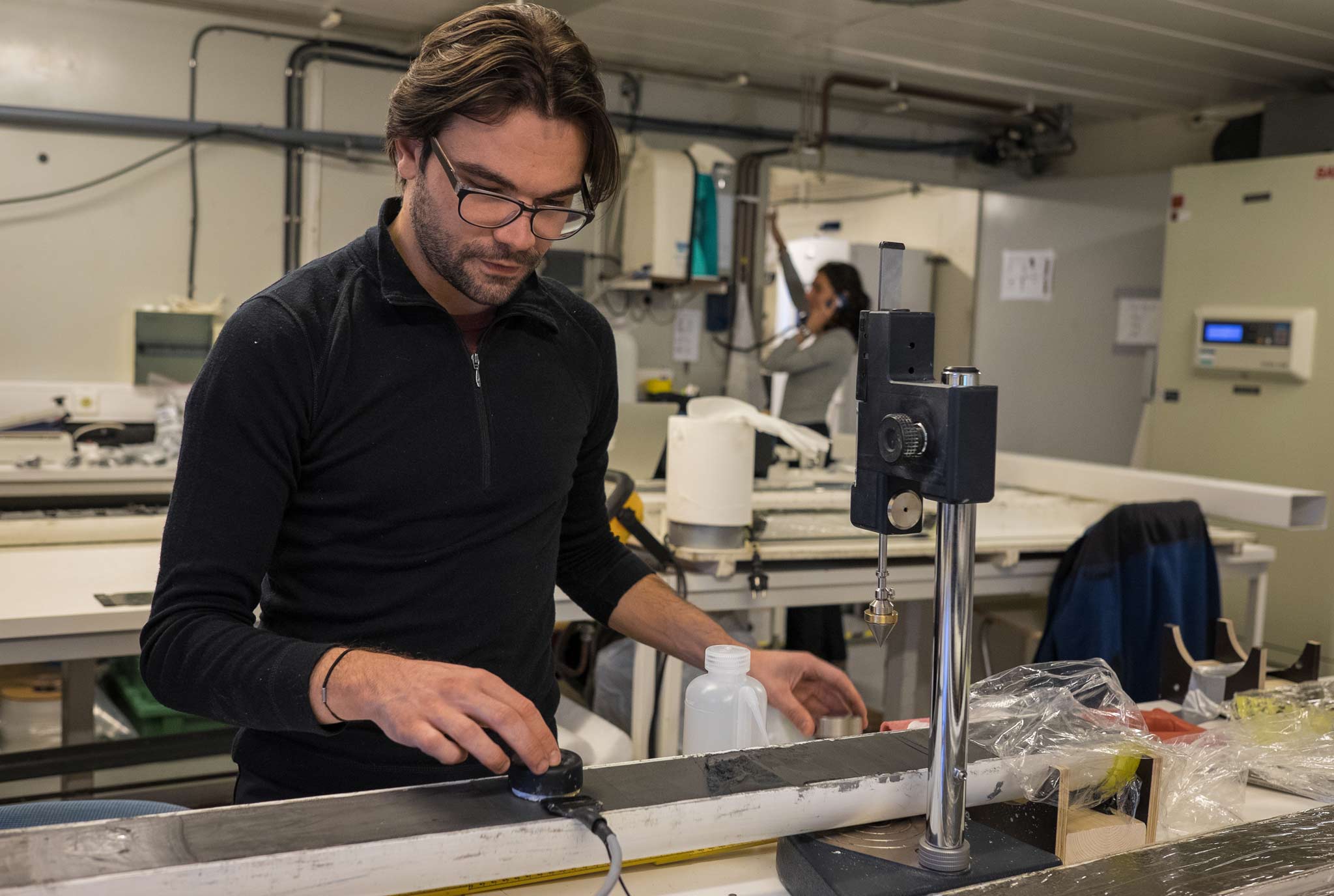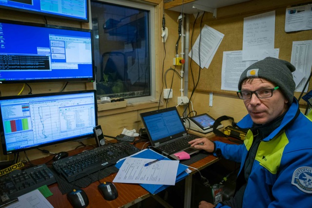 | Laura Gemery (USGS) keeping a watchful eye on the sediment cores piling up in the cooling van | PhD students Natalia Barrientos and Franscesco Muschitiello cutting a multicore liner | Technician Arne Lif is now out of the box and in his chair at the bridge | ||
