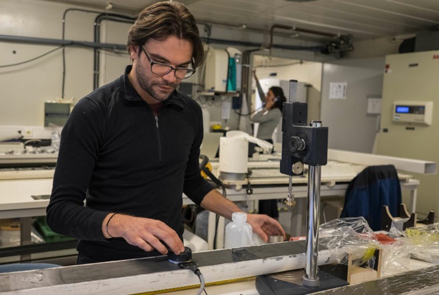 | IGV PhD Pedro Preto in the lab examining a core | Professor Johan Nilsson (MISU) working the CTD | Laura Gemery (USGS), Tom Cronin (USGS), Natalia Barrientos (IGV) examining a core | ||