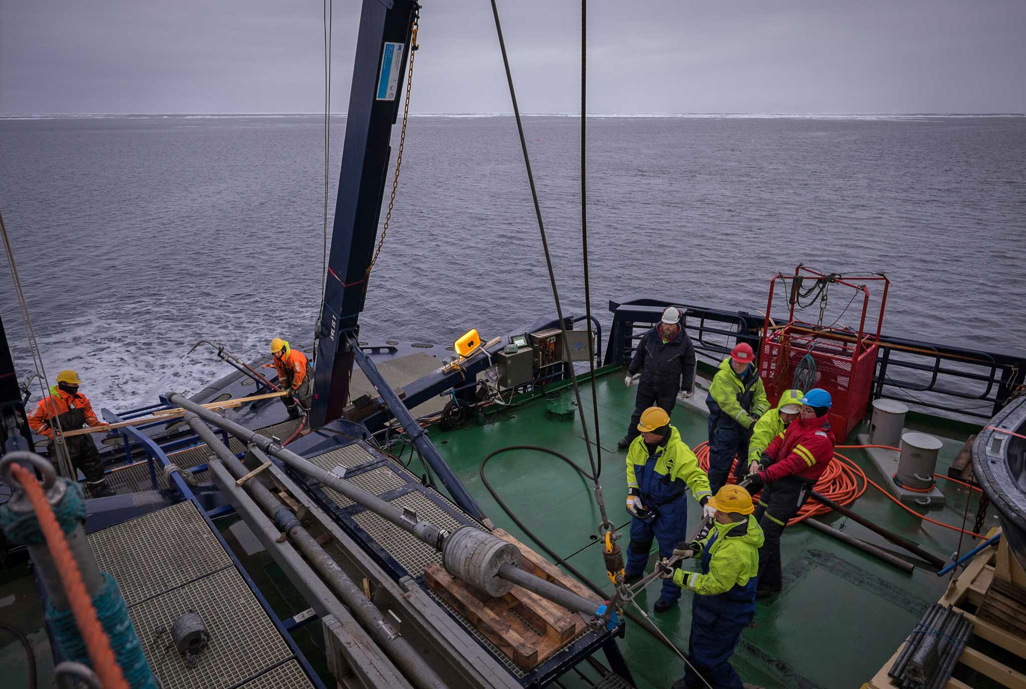 | Rigging gravity core | Björn Eriksson documenting sediment coring procedures | Gravity coring from the aft-deck of icebreaker Oden | ||